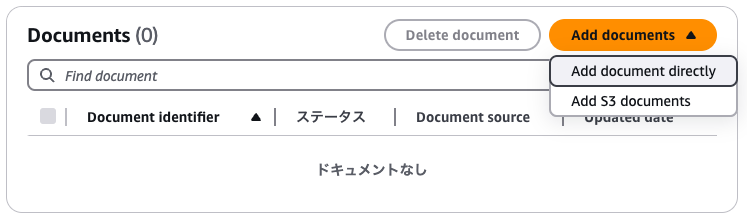 从已创建的知识库进入数据源页面,从 “Add documents”(添加文档)下拉菜单中选择 “Add document directly”(直接添加文档)。