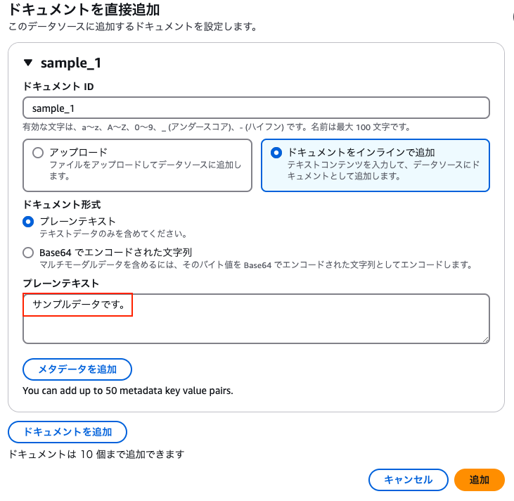 根据用户指南,文档的容量限制似乎为 50MB。由于大容量文档难以通过内联方式定义,因此尝试通过 S3 直接导入文档。准备了 60MB 的 PDF 文件作为测试数据。