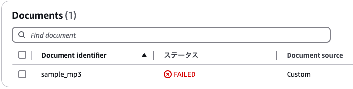 此处尝试从 AWS 管理控制台导入不支持的 MP3 格式音频文件。