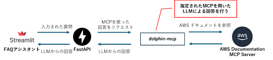 本次实现的架构如下:由 Streamlit 构建的 FAQ 助手,通过 FastAPI 向调用了 AWS Documentation MCP Server 的 LLM 发起回答请求。